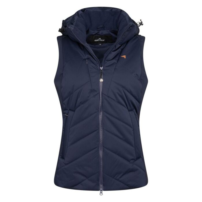 Deze warme bodywarmer Fabiel van Euro-Star in de kleur Navy is gemaakt van satijn geweven stof. Tech shell-stof wordt gebruikt bij de zijpanelen, de armsgaten en bij de capuchon.