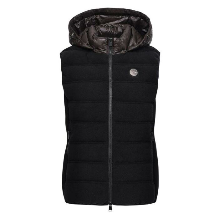 De Fiona is opgebouwd uit een combinatie van zachte fleecepanelen aan de voorzijde, rug en capuchon, gecombineerd met glanzend geweven polyester aan de kraag en windvanger. De zijpanelen zijn gemaakt van elastisch 4-way stretch scuba-materiaal, wat zorgt voor optimale bewegingsvrijheid en een mooi aansluitende pasvorm. De fake down-vulling biedt aangename warmte zonder zwaar aan te voelen. De afneembare en verstelbare capuchon kan elegant aan de achterzijde worden vastgezet. Praktische en stijlvolle details maken deze bodywarmer compleet: een 2-way ritssluiting met HV Polo-logo, een kinbeschermer, zachte microfleecevoering in de steekzakken, elastische biesjes bij de armsgaten en zoom, en een binnenzak met een subtiele glanzende Fakedown-print. Op de borst prijkt een sportieve HV Polo-badge – een kenmerkend detail dat verwijst naar de rijke ruitertraditie. Met de Fiona in Black ben je klaar voor elk wintermoment: warm, functioneel en stijlvol. Verkrijgbaar bij Ruitersport Equidrôme in Venlo, zowel in de winkel als via onze webshop.