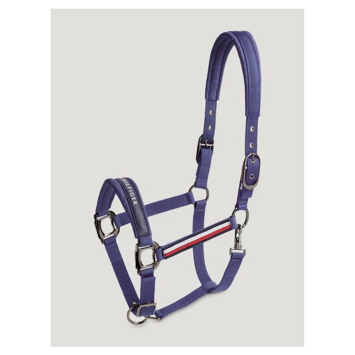 Het Halster Tommy Hilfiger Yale Faded Indigo Cob is een sportieve halsterset met driekleurig halstertouw en verstelbare gespen, verkrijgbaar bij Equidrôme in Venlo en online.