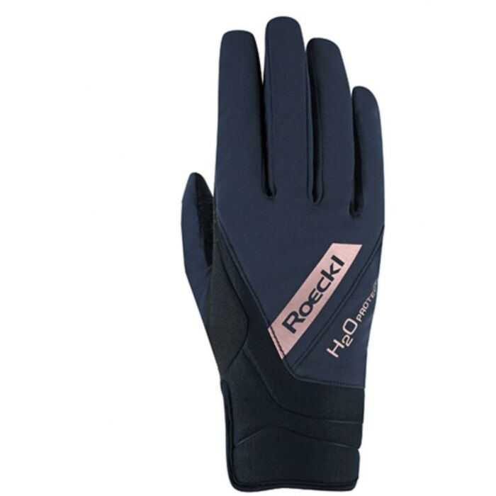Deze nauw gesneden rijhandschoen zit als een tweede huid en is voorzien van een PFC-vrij, zeer ademend en elastisch VaporFlex-laminaat op de backhand. De handpalm is gemaakt van duurzaam DURADERO synthetisch suède en beschikt over uitgebreide siliconen om een antislip grip op de teugels te garanderen. Het model heeft ook een permanent waterdicht en ademend ROECK-TEX MEMBRAAN, dat voorkomt dat de handen koud worden bij zeer ongunstige weersomstandigheden, en de zachte, sneldrogende en klimaatregulerende Easy-Dry voering voor extra warmte en comfort. Praktisch en functioneel: de materiaallagen op de handpalm zijn uitvoerig aan elkaar gelijmd om te voorkomen dat ze verschuiven als de teugels in beweging zijn. De TOUCHSCREEN COMPATIBLE functie op duim en wijsvinger zorgt ervoor dat de handschoenen aan kunnen blijven tijdens smartphone gebruik. De gemakkelijk te sluiten sluiting op de neopreen manchet zorgt ervoor dat de WAREGEM-handschoen de pols goed en betrouwbaar omsluit. Omdat rijders de kans waarderen om hun gevoel voor stijl te behouden bij het beoefenen van hun favoriete tijdverdrijf, heeft ROECKL bovendien metalen applicaties op de rug van de hand aangebracht.