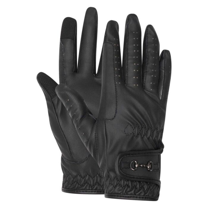 Sportief gevormde rijhandschoenen in de kleur zwart van HV Polo. De handschoen is gemaakt van Serino stof met kleine gaatjes voor ventilatie. Met de handschoen aan kun je nog je smartphone bedienen met de finger touch functie die in de handschoen zit. Er zit een manchet met elastiek en klittenbandsluiting voor een strakke pasvorm.