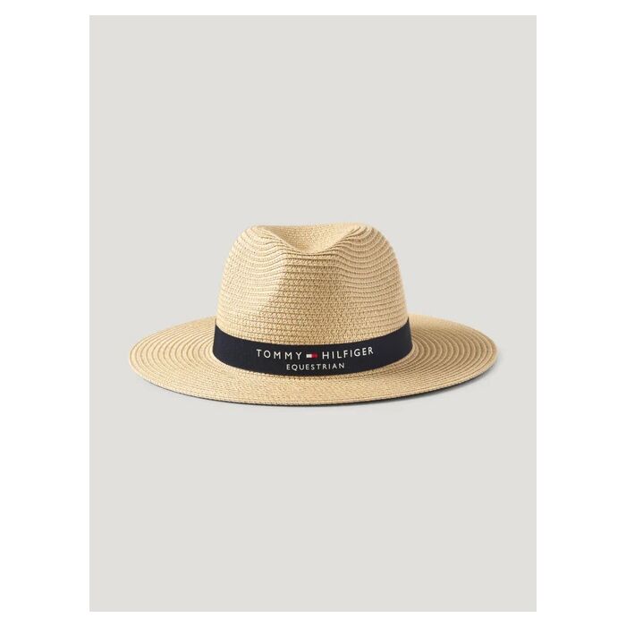 De Hoed Tommy Hilfiger Westfield in de kleur Beige Seasonal is een natuurlijke strohoed met een brede rand en een stijlvol Tommy Hilfiger logoband, perfect voor zonnige dagen en verkrijgbaar bij Equidrôme in Venlo en online.
