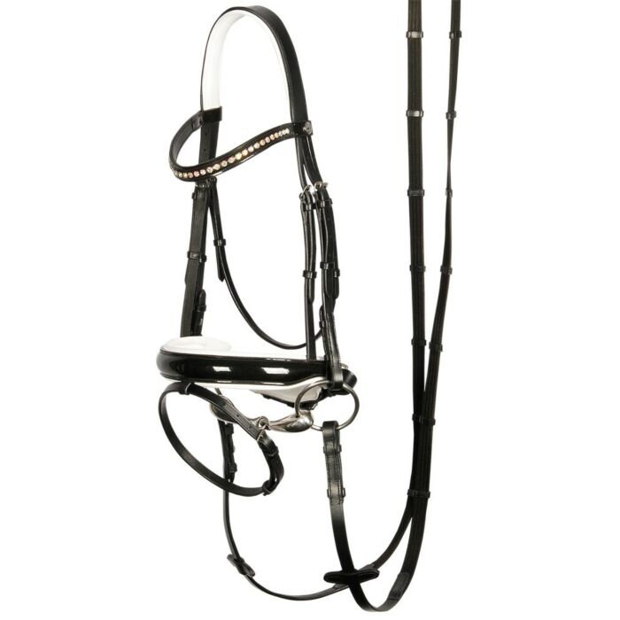 De luxe, brede aansnoerneusriem met lak is 4CM breed (incl. witte padding) en is anatomisch gevormd rond het bit. Met speciaal, anatomisch, zacht onderlegd kopstuk. Elegante smalle riempjes voor onder andere de keelriem. Uitgevoerd met luxe, hangende frontriem met lak en schitterende AB-kristallen. Blinde sluitingen aan bakstukken en teugels. Het hoofdstel wordt geleverd inclusief webband teugels.