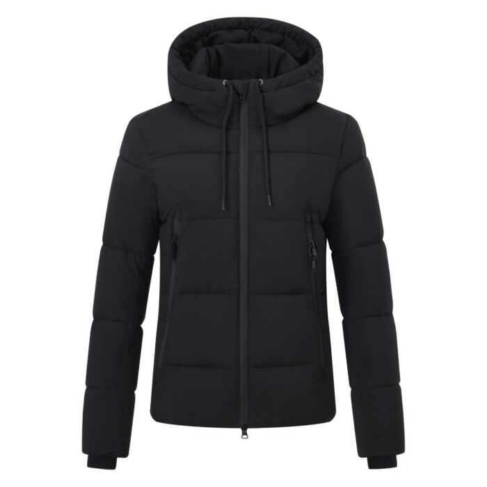 Warme dameswinterjas met capuchon, zachte binnenboorden en verstelbare tailleband in de kleur Black.