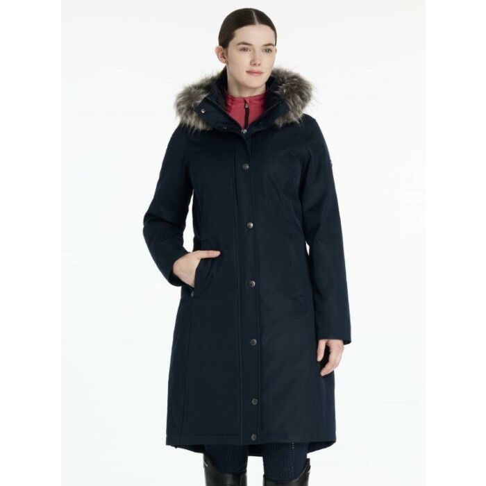 De Jas LeMieux Anya Navy is een elegante waterdichte rijjas met zachte imitatiebontvoering en slimme technische details die ruiters warm, droog en stijlvol houden tijdens winterse ritten.