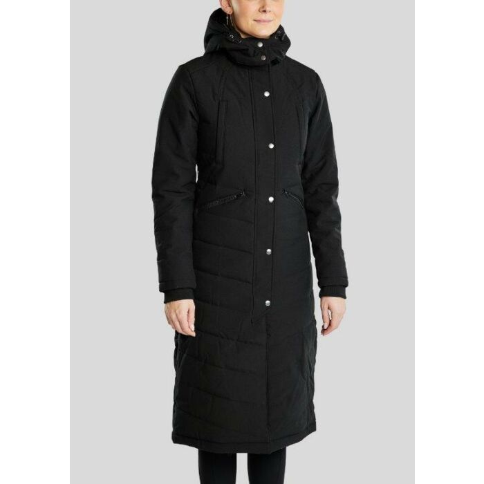 De Montar Dicte jas in Black is een stijlvolle en functionele lange winterjas voor ruiters, met een water- en vuilafstotende buitenlaag, warme Sustans™ isolatie, afneembare capuchon en praktische ritszakken, perfect voor comfort en elegantie in koude omstandigheden.