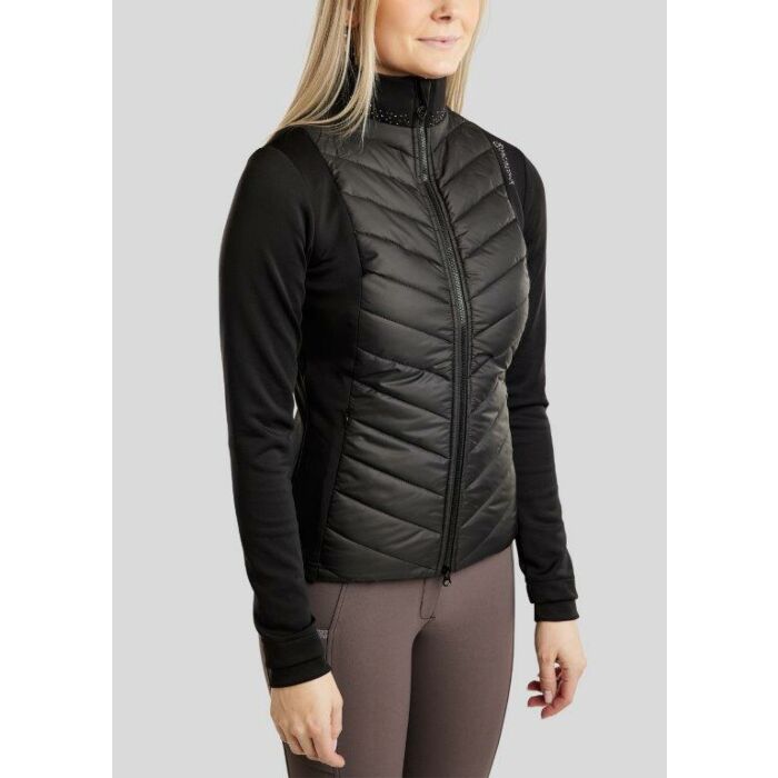 De Montar MoEmilia jas in Black combineert sportieve elegantie met een vleugje glamour. De hybride constructie met gewatteerde panelen en zachte softshell zorgt voor warmte, comfort en een stijlvolle uitstraling – perfect voor ruiters die functionaliteit en luxe willen verenigen.
