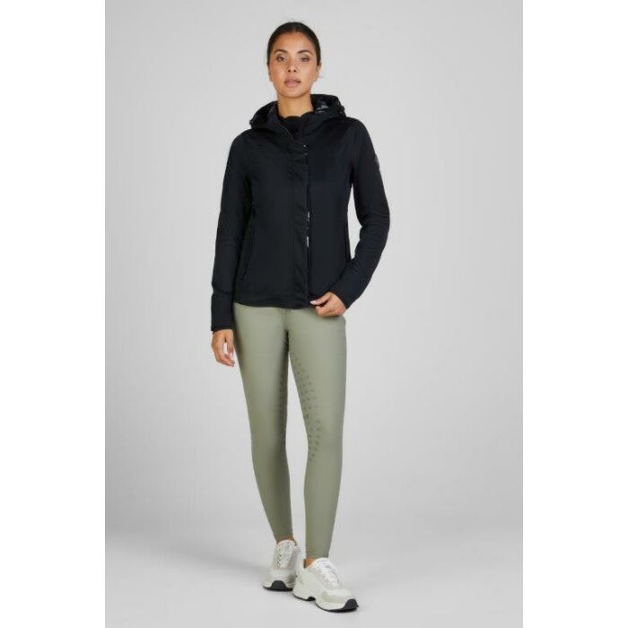 De ademende mesh binnenvoering en de multilayer mesh aan de binnenkant zorgen voor uitstekende luchtcirculatie, waardoor je fris blijft, zelfs tijdens intensieve trainingen. Daarnaast is de jas voorzien van een losse rugpas met mesh aan de binnenkant, wat zorgt voor extra ventilatie en een aangenaam draagcomfort. Deze jas is volledig water- en winddicht dankzij de gelaste naden, waterdichte ritsen en elastische windstoppers bij de mouwen. De MAGNET CLICK technologie maakt het hanteren van de rits eenvoudig en houdt de capuchon op zijn plaats wanneer je hem niet gebruikt. De elastische band aan de achterkant met Pikeur Athleisure print geeft de jas een sportieve uitstraling, terwijl de matte strepen op de afwerkingen, capuchonrand en zakken een subtiele, moderne touch toevoegen. Met zijn heuplange, licht afgeronde pasvorm is de Pikeur Softs jas in Black een veelzijdige en stijlvolle keuze voor ruiters en outdoorliefhebbers. Nu verkrijgbaar bij Ruitersport Equidrome – bestel online of kom langs in de winkel om hem zelf te passen!