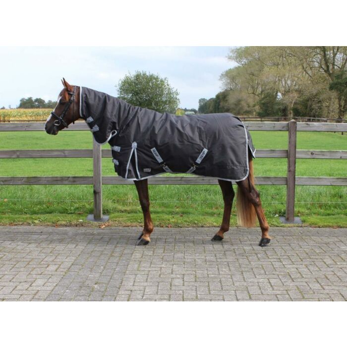Basis regendeken met 300 grams voering. Voorzien van een vaste hals met voering zodat het paard extra is beschermd tegen kou en regen. De deken is waterdicht en ademend.