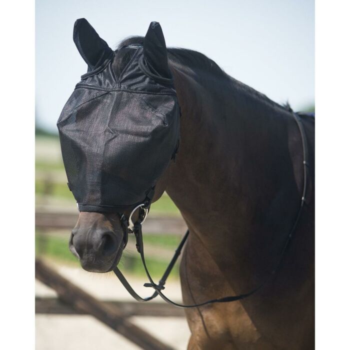 Vliegenmasker die makkelijk te bevestigen is aan het kopstuk, de bakstukken en de neusriem van een hoofdstel. Daarom is het masker gemakkelijk te gebruiken tijdens het rijden. Het masker is gemaakt van stevige mesh en rondom de oren van een fijne, soepele mesh.