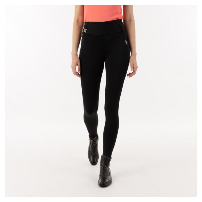 Rijbroek uit de zomercollectie van Anky in de kleur zwart gemaakt van stretchstof met een uitstekende vochtafvoerende en ademende eigenschappen. Matte ton-sur-ton siliconenprint op het zitvlak voor extra grip. De hofe taillenad heeft een knoop en een metalen logo. Aan de voorkant zitten zakken die afgewerkt zijn met strass steentjes en zwart biezen. De broek heeft aan de voorkant ook nog twee extra diepe zakken voor je mobiele telefoon.