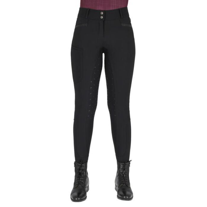 Ademende rijbroek uit de QHP Zahra collectie met hoge taille medium fullgrip en glitterdetails in de kleur Black.