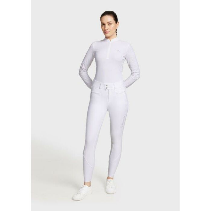 De Claranova in de kleur wit is een rijbroek met ultrahoge taille, een stijlvolle 'V'-snit en plooidetail aan de achterkant. Versierd met Swarovski 'Ultra Fine Rock' riemlussen en zakdetails, verfijnde stiksels en een klassiek kristallen logo, belichaamt deze rijbroek een moeiteloos verfijnd ontwerp. Gemaakt van in vier richtingen stretchend Italiaans materiaal dat de rijder een tweede huidgevoel geeft met totale bewegingsvrijheid met extra zeslaagse grip die volledige stabiliteit in het zadel biedt. Extra kenmerken zijn onder meer een telefoonzak, compressie op de kuit die de bloedstroom verhoogt en een elastisch binnenpaneel om je shirt op zijn plaats te houden.