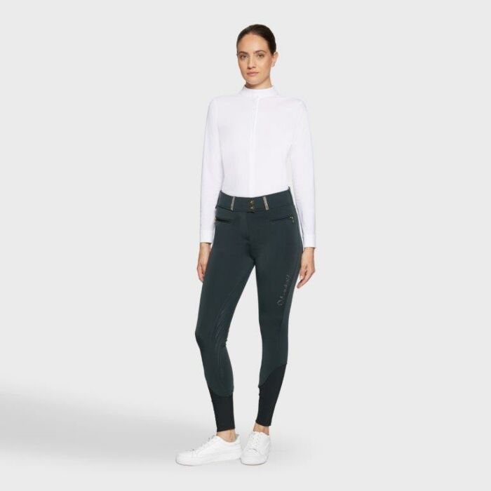 De Samshield Rijbroek Claranova Winter met fullgrip in de kleur groen combineert elegante details met geavanceerde functionaliteit, speciaal ontworpen voor koude weersomstandigheden. De adembenemende Swarovski Crystal Fabric decoratie geeft deze rijbroek een luxe uitstraling, perfect voor ruiters die stijl en prestaties willen combineren. Deze rijbroek is gemaakt van ademende, vierweg stretchstof met UV-bescherming die voorkomt dat de kleur vervaagt, zelfs na intensief gebruik. De ultra hoge taille met een stijlvolle V-snit aan de achterkant biedt een flatterende look en maximale ondersteuning tijdens het rijden. Het verborgen telefoonvakje in de tailleband en de geplooide achterzijde zorgen voor extra comfort en een perfecte pasvorm. De broek is voorzien van handige ritszakken en duurzame zigzag-topstitching voor extra duurzaamheid. De fullgrip zorgt voor maximale grip en stabiliteit in het zadel, waardoor je zelfs tijdens intensieve trainingen verzekerd bent van optimaal comfort en prestaties. Verkrijgbaar in de kleur groen bij Ruitersport Equidrôme!