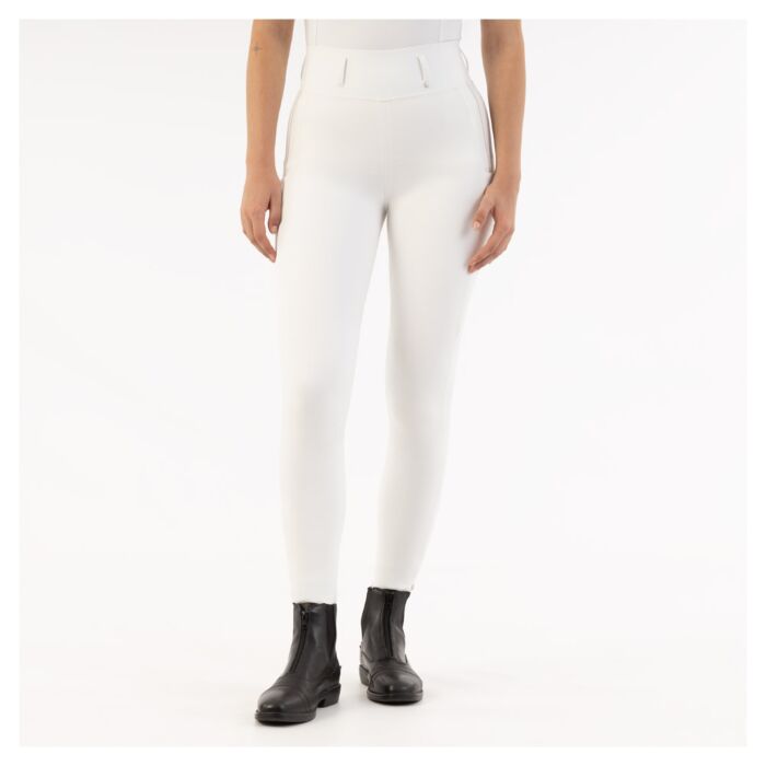 Witte dames rijlegging maat 34 met hoge taille, full grip siliconen zit en telefoonzak, ideaal als wedstrijd rijbroek, verkrijgbaar bij Equidrôme in Venlo en online.