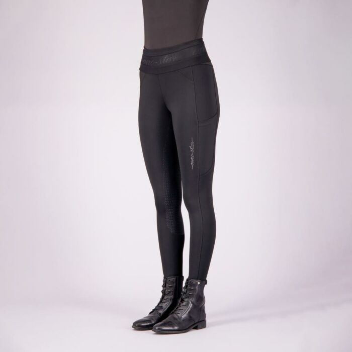 Deze rijlegging heeft een zeer comfortabele, zachte en ondersteunende hoge tailleband. Langs de taille loopt een elastische merkband met metallic garen. Aan beide zijkanten zitten telefoonzakjes en op het linkerbeen zitten strass steentje in de vorm van het HV Polo logo. Langs de naden zitten twee naaldstiksels en aan de voorkant nepzakken. De legging heeft vloeiende lijnen voor een perfecte vrouwelijke vorm. Wil je rijlegging Ares in de kleur Black graag passen? Bezoek onze winkel. Equidrome is 7 dagen per week geopend.