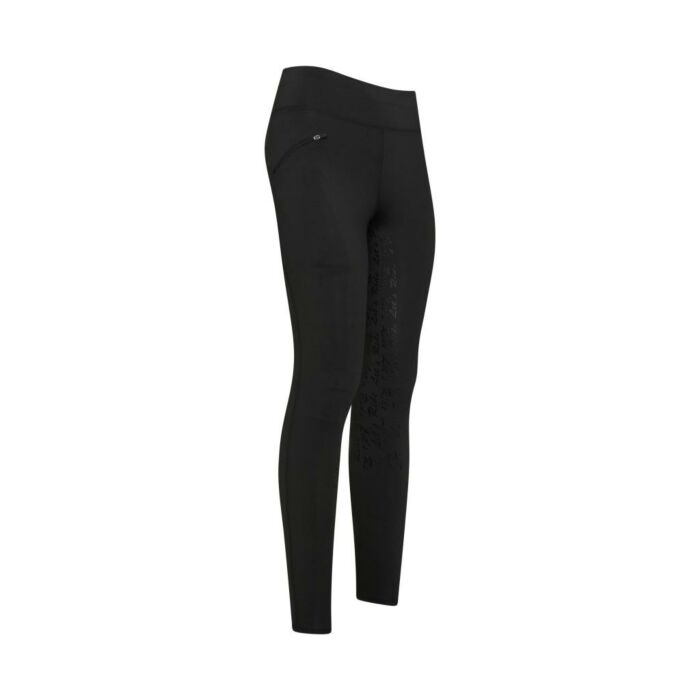 Trendy rijlegging met volledige zitvlak en extra hoge, elastische comfortband. Super comfortabel en uiterst praktisch: dat is de Dietse Fullgrip rijlegging. Het gebruikte materiaal is super rekbaar en comfortabel om te dragen. Vaarwel tegen het knijpen in een ongemakkelijke rijbroek! Geen riemlussen of knopen, geen schurende naden die ergens kunnen knellen of wrijven! Het draagcomfort is vergelijkbaar met moderne jogging- of yogabroeken. Deze legging zit heerlijk en biedt een extreem hoge bewegingsvrijheid. In het zadel zorgt de siliconen volledige grip in de statement print "Let's Ride" voor veiligheid. Comfortabel, stijlvol en functioneel: ademend, knuffelig, vuil- en waterafstotend. Extra groot vakje (voor bijvoorbeeld je smartphone) in de hoge tailleband aan de achterkant. Voorvak met ritssluiting voor kleine waardevolle spullen of lekkernijen. Leuke bijwerking: Door het nauwsluitende materiaal van deze rijbroek worden de benen slanker en de hoge, elastische tailleband helpt een klein buikje te verbergen. De elastische beenuiteinden passen gemakkelijk in laarzen en chaps. De stevige maar niet-drukkende pasvorm voorkomt dat de broekspijp wegglijdt.