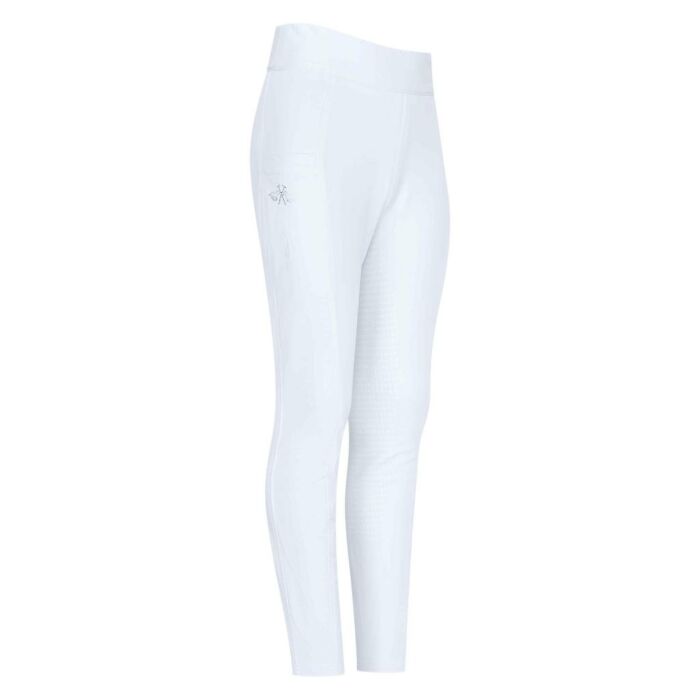 Fijne jersey legging Lotte uit de zomercollectie van HV polo in de kleur wit. Aan beide zijden zit een telefoonzakje en op het rechter telefoonvak een logo afbeelding met geprinte paarden en strass steentjes. De leggin heeft een volledige siliconen grip.