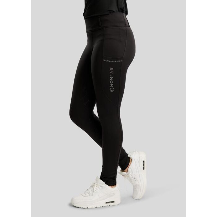 De Montar MoEverlisa Junior rijlegging fullgrip in de kleur Black in maat 164 is ontworpen voor jonge ruiters die stijl en functionaliteit willen combineren. De diepe zwarte kleur geeft een elegante en sportieve uitstraling, terwijl de champagnekleurige kristallen langs de zak en het Montar logo zorgen voor een verfijnd detail. De comfortabele pasvorm sluit mooi aan op het lichaam en biedt volledige bewegingsvrijheid tijdens het rijden. De fullgrip siliconen print zorgt voor een stabiele zit in het zadel en geeft extra zekerheid tijdens het rijden. De praktische telefoonzak maakt het eenvoudig om kleine spullen veilig mee te nemen. Het ademende en elastische materiaal voelt zacht aan en beweegt soepel met je mee. Deze stijlvolle junior rijlegging is verkrijgbaar bij Equidrôme in Venlo en online.