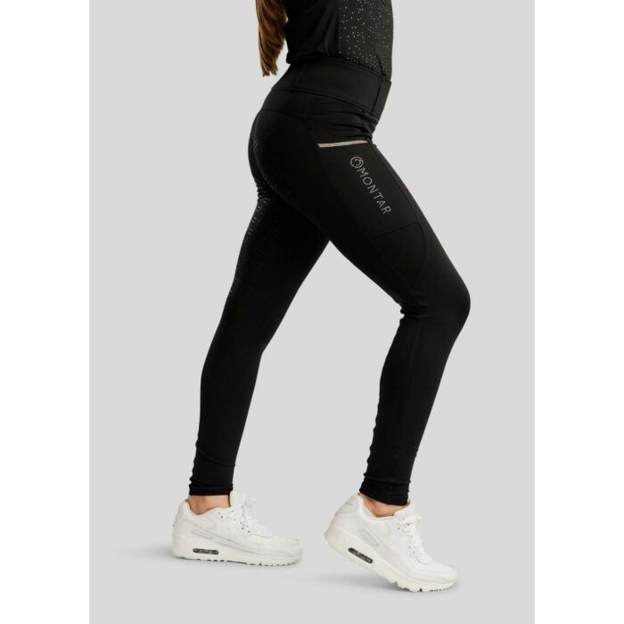 Rijlegging Montar MoLila Junior Black 128 is ontworpen voor jonge ruiters die tijdens het rijden comfort en bewegingsvrijheid willen combineren met een stijlvolle uitstraling. De zachte elastische stof sluit mooi aan en beweegt soepel mee tijdens het rijden en het verzorgen van het paard. De fullgrip siliconen zit biedt extra stabiliteit in het zadel terwijl de praktische zak op het bovenbeen ruimte geeft voor kleine spullen. De champagnekleurige kristaltape en het Montar logo in kristallen geven deze junior rijlegging een luxe uitstraling die perfect past bij de Montar zomercollectie. Deze rijlegging is geschikt voor dagelijks gebruik en trainingen en is verkrijgbaar bij Equidrôme in Venlo.
