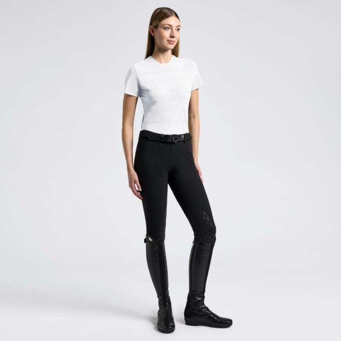 Het klassieke ontwerp met een ronde hals en korte mouwen maakt het shirt tijdloos en veelzijdig. De iconische Cavalleria Toscana branding op de borst en het stijlvolle embleem op de mouw geven het shirt een exclusieve uitstraling die perfect aansluit bij de luxueuze ruitersportmode. Dankzij de stretchy pasvorm sluit het shirt mooi aan op het lichaam zonder bewegingsvrijheid te beperken, wat essentieel is voor comfort in het zadel. Dit witte Cavalleria Toscana shirt is perfect te combineren met rijbroeken in zowel donkere als lichte tinten en vormt een stijlvolle aanvulling op iedere ruitergarderobe. Geschikt voor zowel training als wedstrijden, dit premium shirt biedt de perfecte balans tussen functionaliteit en elegantie.
