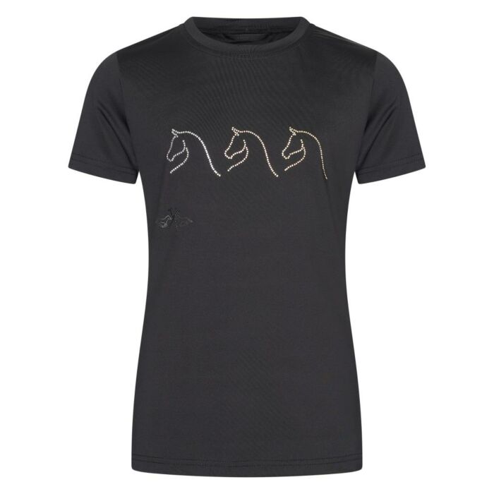 Op de voorzijde schitteren drie prachtig vormgegeven paarden, elk versierd met glinsterende rhinestones in verschillende kleuren. Dit unieke en opvallende ontwerp zorgt ervoor dat je altijd in de spotlight staat. Een perfecte keuze voor elke gelegenheid, van een dagje uit tot een ontspannen middag. Voeg het Shirt HV Polo Wesla in Black vandaag nog toe aan je collectie, verkrijgbaar bij Ruitersport Equidrome!
