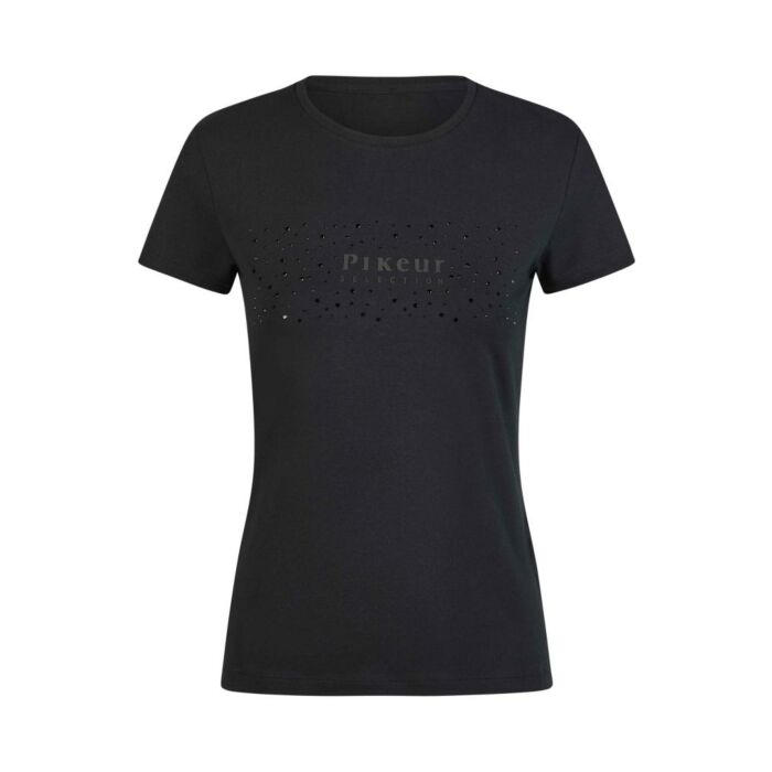 Het Pikeur Selection shirt in Black in maat 34 is een stijlvol en comfortabel katoenen shirt uit de Pikeur zomercollectie dat perfect past bij een verzorgde en vrouwelijke ruiterlook, het zachte katoen voelt prettig aan op de huid en biedt een comfortabel draaggevoel tijdens dagelijkse activiteiten op stal of in de rijbak, de smalle pasvorm sluit mooi aan en zorgt voor een elegante uitstraling, op de borst is het shirt voorzien van een verhoogde Pikeur Selection siliconenprint die wordt omringd door verfijnde steentjes wat zorgt voor een luxe en opvallend detail, op de achterzijde is het shirt afgewerkt met subtiel siliconen rhinestone labeling wat het ontwerp compleet maakt, dit Pikeur shirt in maat 34 is verkrijgbaar bij Equidrôme in Venlo en eenvoudig online te bestellen.