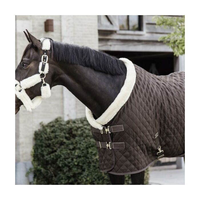 De Showdeken is gemaakt van 600D high tenacity polyester met een stijlvolle en tijdloze diamantvormige quilting. Hierdoor is het erg moeilijk het deken te scheuren en blijft er geen schaafsel aan het deken kleven. Om druk op de schouders en de schoft te verlichten, is de kraag van de showdeken gemaakt van onze populaire artificiële schapenvacht. Naast een chique uitstraling is de artificiële wol ook veel comfortabeler. Wanneer je paard bijvoorbeeld aan het eten is, zal de deken niet in de borst snijden. De Showdeken heeft een vulling van 160 gram fiber fil, wat dezelfde eigenschappen heeft als dons maar geen geuren absorbeert. Om schuurplekken te voorkomen, is de deken gevoerd met onze kenmerkende artificiële konijnenvacht. Deze stof is extreem zacht en zorgt voor een glanzend effect op de vacht van het paard. Bovendien creëert de artificiële konijnenvacht kleine luchtzakjes. Deze zakjes vangen de lichaamswarmte van het paard op en houden deze vast, waardoor een extra isolerende laag ontstaat. De combinatie van de materialen zorgt voor een zeer ademend deken met een hoge warmte-gewicht verhouding. DE Showdeken is anatomisch gevormd en dankzij de artificiële konijnenvacht moet je je geen zorgen meer maken over de positie van de deken. De deken schuift namelijk altijd terug op zijn plaats, zelfs na het rollen. Om de druk beter te verdelen, sluiten de voorflappen als een Z. Deze voorflappen zijn eenvoudig te verstellen voor een perfecte pasvorm. De kruissingels en het bilkoord zijn ook verstelbaar en afneembaar. Dankzij de flexibiliteit van het deken kan hij voor meerdere doeleinden worden gebruikt en gecombineerd worden met andere Kentucky dekens.