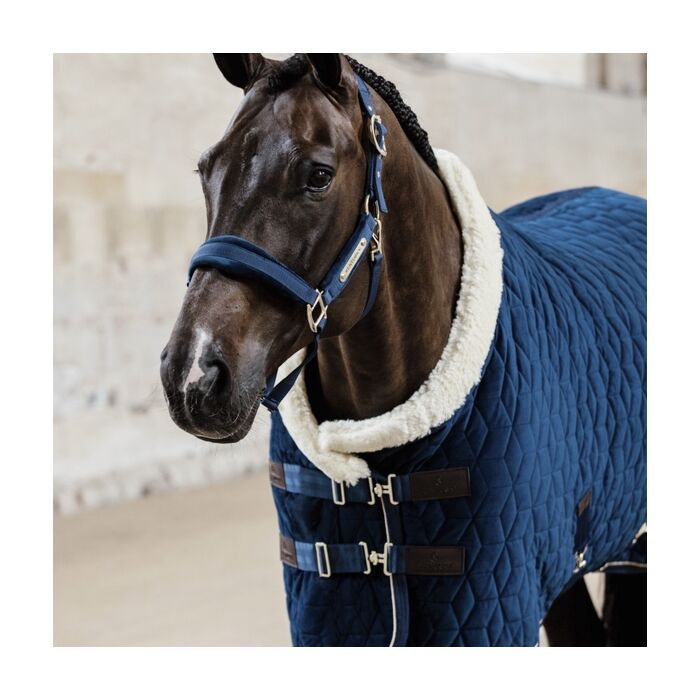 Naast onze kenmerkende Show Rug hebben we nu een chique fluwelen uitvoering. Omdat Kentucky staat voor innovatie, hebben we een showdeken ontwikkeld met onze beroemde fluwelen stof. Door de fluwelen stijl en de elegante kunstmatige schapenvacht op de kraag is het fluwelen vloerkleed een echte eye-catcher! Met de Showdeken Velvet val je zeker op in de stal. De deken heeft een vulling van 160 gram en is in de winter perfect te gebruiken als staldeken in huis of op shows. De buitenkant van het vloerkleed heeft een zachte en chique fluwelen stof en een verfijnde doorgestikte laag. De kubus gewatteerde laag maakt het voor paarden een stuk moeilijker om de deken te scheuren. De binnenkant van de deken heeft een kunstmatige voering van konijnenhuid, die wrijvingsplekken vermijdt. De kunstmatige konijnenhuid creëert ook kleine luchtzakjes die een geïsoleerde laag rond je paard creëren en hem extra warm houden. Dankzij de kunstmatige konijnenhuid aan de binnenkant van de deken blijft de Showdeken Velvet op zijn plaats na het rollen of liggen. De deken kan worden vastgemaakt met twee dubbele voorsluitingen en twee kruissingels die zijn afgewerkt met de kenmerkende Kentucky kunstlederen patches. Het fluwelen vloerkleed is wasbaar op 30 graden en behoudt zijn zachtheid na het wassen. Het bungee koord is door de plastic hoes makkelijk schoon te maken met een natte doek.