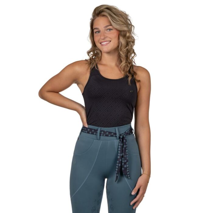 De top is gemaakt van een soepele stretchstof (91% polyester, 9% elastaan) die zorgt voor een comfortabele pasvorm en optimale bewegingsvrijheid. De subtiele kristallen print geeft de tanktop een luxe uitstraling, terwijl de contrasterende bandjes op de rug een sportieve en moderne touch toevoegen. Op de linkerborst is de tanktop afgewerkt met een luxe Q-pin, die het geheel een elegante finishing touch geeft. Deze tanktop is niet alleen stijlvol, maar ook perfect te combineren met andere items uit de Micah collectie, zodat je altijd een complete en harmonieuze outfit hebt. Eenvoudig te onderhouden: machinewasbaar op 30 graden. Voor langdurige kwaliteit wordt aanbevolen geen wasverzachter te gebruiken en de tanktop niet in de droger te drogen. De Tanktop QHP Micah in de kleur Black is verkrijgbaar bij Ruitersport Equidrome. Een stijlvolle en comfortabele keuze voor iedere ruiter!