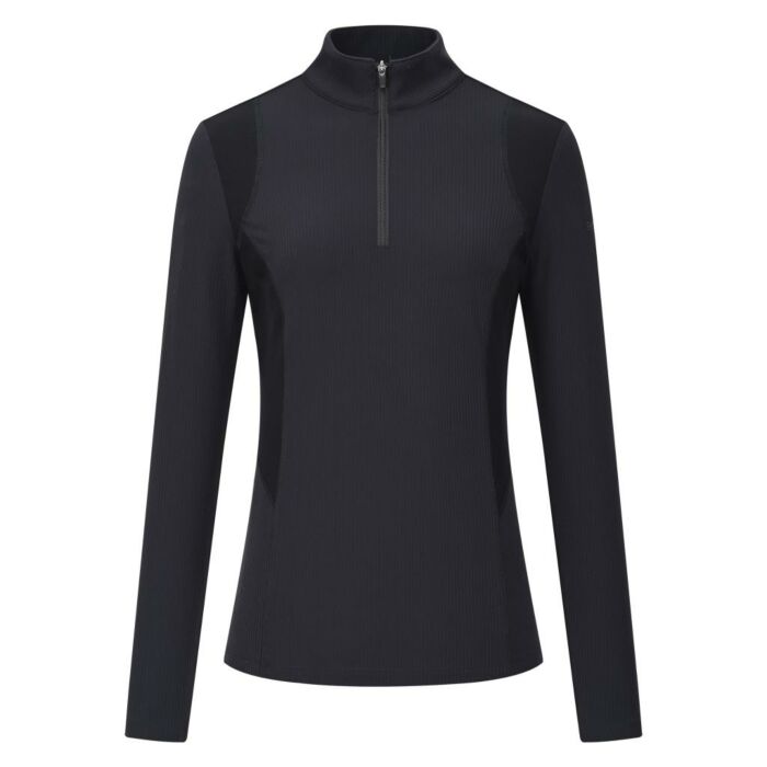 Het Euro-Star Alice trainingsshirt in de kleur Black combineert technische prestaties met een vrouwelijke, sportieve look. Dankzij de verfijnde combinatie van ademende meshpanelen en ondersteunende ribstructuren biedt dit shirt optimale ventilatie en bewegingsvrijheid tijdens intensieve trainingsmomenten. De nauwsluitende pasvorm volgt elegant de contouren van het lichaam en zorgt voor een verfijnde uitstraling in én buiten het zadel. Op de rug is een subtiel gevormd compressiepatroon verwerkt dat niet alleen visueel versterkt, maar ook bijdraagt aan een verbeterde houding tijdens het rijden. De praktische halve ritssluiting aan de voorzijde zorgt voor een sportieve touch en extra comfort. Een geborduurd paardensilhouet op de linkermouw vormt de finishing touch van dit hoogwaardige ontwerp. Verkrijgbaar bij Ruitersport Equidrôme in Venlo.