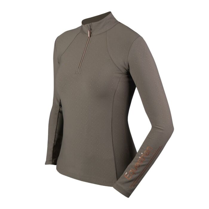Klassiek, mooi vormgegeven trainingshirt in de kleur bruin uit de wintercollectie van Horka met lange mouwen uit een hoogwaardige comfortabele stretchstof. Het materiaal van het shirt is ademend en sneldrogend. Het shirt beschikt over een halve rits aan de voorkant en een kleine opstaande kraag.