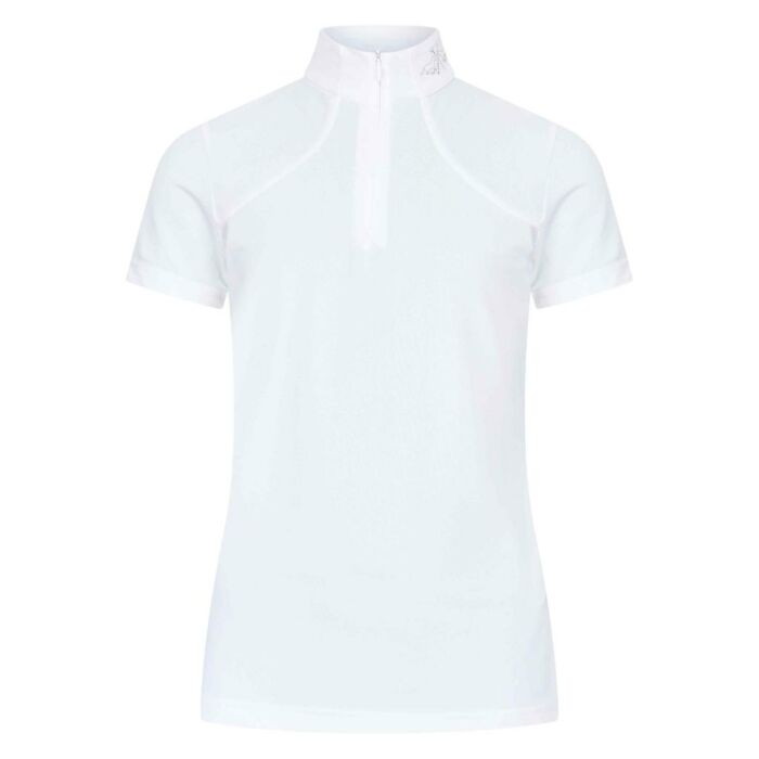 Top met korte mouwen in de kleur wit van mesh-stof met kraag. Op de kraag aan de linkerkant bevindt zich een logo met gedrukte paarden en strass-stokjes. Korte blinde ritssluiting middenvoor.
