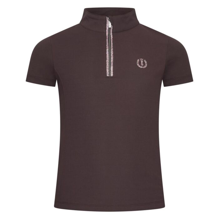 Comfortabel en trendy trainingsshirt voor jonge ruiters van Imperial Riding in de kleur Chocolate met korte mouwen en halve rits, maat 164, verkrijgbaar bij Equidrôme in Venlo.