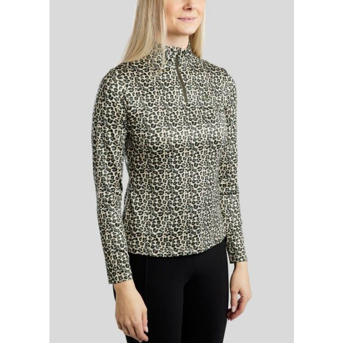 Het Montar MoLeonora trainingsshirt met lange mouwen in Olive combineert een stijlvolle allover luipaardprint met hoogwaardig draagcomfort, waardoor het een perfecte mix is van mode en functionaliteit voor de ruiter.