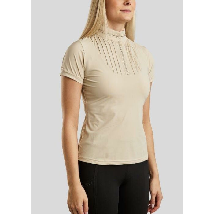 Het Montar Refined MoZitta trainingsshirt in de elegante kleur Warm Light Grey is een stijlvolle toevoeging aan de nieuwe tussencollectie van Montar. Dit shirt straalt luxe uit door de verfijnde plooien en de subtiele glinsterende details op de opstaande kraag en de rug. De vrouwelijke pasvorm zorgt voor een flatterende uitstraling en biedt tegelijkertijd optimaal comfort tijdens het rijden.