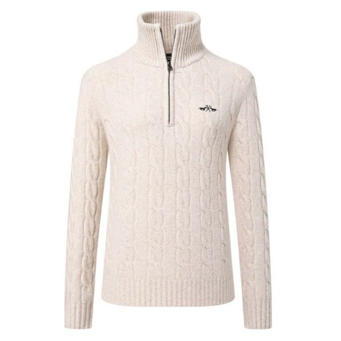 De Trui HV Polo Dunya in de kleur Natural is een verfijnde pullover die moeiteloos klasse, comfort en subtiele paardensportdetails combineert. Gemaakt van een luxueus kabelbreisel en ontworpen in een elegante slanke pasvorm, is deze trui een stijlvolle aanvulling op elke ruitergarderobe – perfect voor de koude seizoenen waarin je warmte en uitstraling wilt combineren.