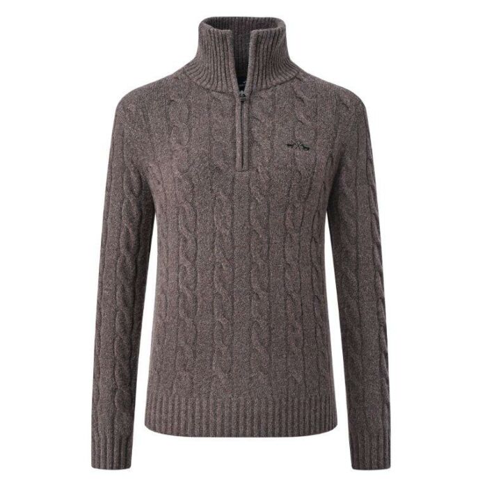 Dankzij de hoge opstaande kraag met halve ritssluiting biedt deze trui bescherming tegen koude wind, terwijl je hem eenvoudig open of gesloten kunt dragen. De tonale ribboorden aan de mouwen en onderzijde zorgen ervoor dat de trui goed in model blijft en langdurig comfortabel zit. De volledig afgewerkte armsgaten verhogen het draagcomfort en onderstrepen de hoogwaardige afwerking. Op de borst is het herkenbare HV Polo paardenlogo geborduurd met glinsterend lurexgaren – een subtiel maar stijlvol accent. Onderaan de zoom vind je een metalen horse bit dat op elegante wijze verwijst naar de klassieke rijkunst. Deze trui vormt een prachtig basisstuk voor je ruiteroutfits, of je hem nu draagt in de stal, tijdens een buitenrit of gewoon als modieus item in je vrije tijd. Verkrijgbaar bij Ruitersport Equidrôme in Venlo, zowel in de winkel als via onze webshop.