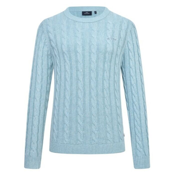 De trui HV Polo Tally Pretty Aqua Sky in maat XS is een stijlvolle en comfortabele trui voor ruiters die houden van een lichte en frisse kleur met een luxe uitstraling. Het zachte katoenen kabelbreisel voelt prettig aan op de huid en is ideaal voor koelere momenten op stal of tijdens een ontspannen dag buiten het rijden. Het klassieke kabelpatroon geeft de trui een tijdloze uitstraling, terwijl de ribgebreide ronde hals, manchetten en zoom zorgen voor een mooie en comfortabele pasvorm. De subtiele HV Polo details zoals het zwarte metalen paardenlogo en de metalen coin geven de trui een verfijnde afwerking. De pretty aqua sky kleur zorgt voor een frisse en moderne look. Verkrijgbaar bij Equidrôme in Venlo en online.