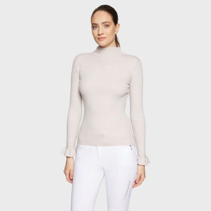 De Samshield Lidia Ruffle trui in Feather is een elegante damestrui met subtiele ruffle details en Swarovski® kristallen. Het lichte maar warme design met hoge kraag combineert comfort met een luxueuze uitstraling, ideaal voor ruiters in de winter en dagelijks gebruik.