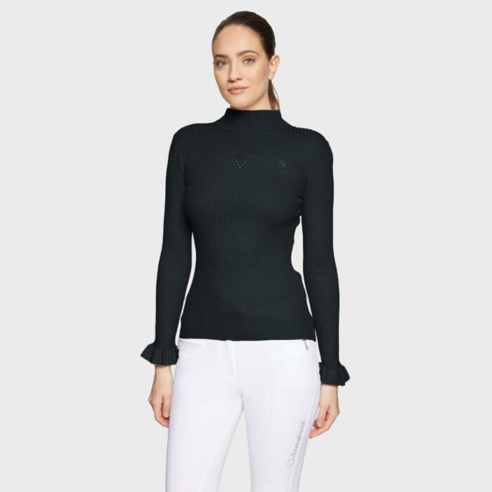 De Samshield Lidia Ruffle trui in Moonless Night is een stijlvolle damestrui met ruffle details en Swarovski® kristallen. Het lichte maar warme ontwerp met hoge kraag combineert elegantie en comfort en is ideaal voor ruiters tijdens koude dagen en dagelijks gebruik.