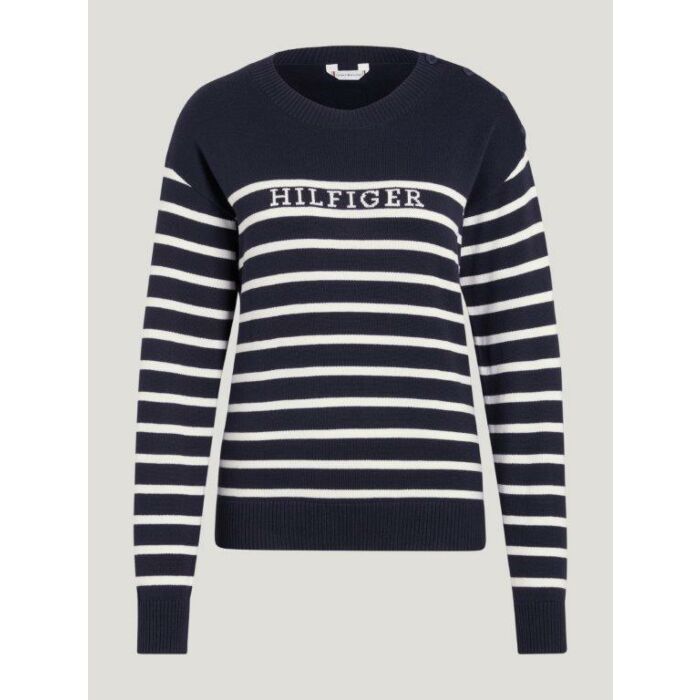 De ronde hals is afgewerkt met een verfijnd knoopdetail op de schouder, wat zorgt voor een speelse twist. Op de borst prijkt het iconische Hilfiger-logo in intarsia breiwerk, wat deze trui direct herkenbaar maakt. Ideaal voor frisse lenteochtenden of als casual chique outfititem. Verkrijgbaar bij Ruitersport Equidrôme in Venlo.