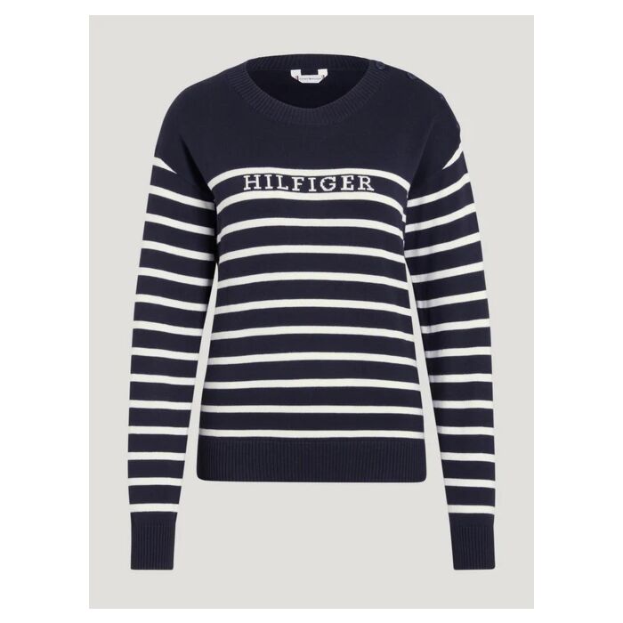 De Trui Tommy Hilfiger Fairfield Stripe in de kleur Desert Sky in maat L is een comfortabel gebreide trui met een klassieke uitstraling en een normale pasvorm, perfect voor ruiters die stijl en comfort willen combineren, verkrijgbaar bij Equidrôme in Venlo en online.