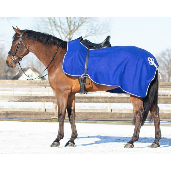 Deze uitrijdeken van QHP is te gebruiken tijdens het loswerken en uitstappen om te voorkomen dat het paard te snel afkoelt. Het zilveren sierkoord en ornament op de achterkant geeft deze deken een chique uitstraling. De deken is uitgevoerd met een klittenbandsluiting op de schoft.