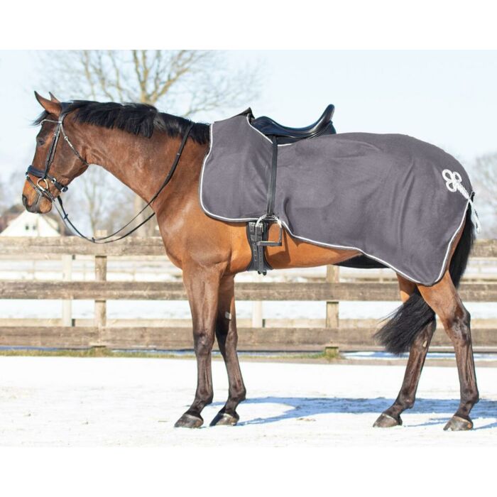 Deze uitrijdeken van QHP is te gebruiken tijdens het loswerken en uitstappen om te voorkomen dat het paard te snel afkoelt. Het zilveren sierkoord en ornament op de achterkant geeft deze deken een chique uitstraling. De deken is uitgevoerd met een klittenbandsluiting op de schoft.