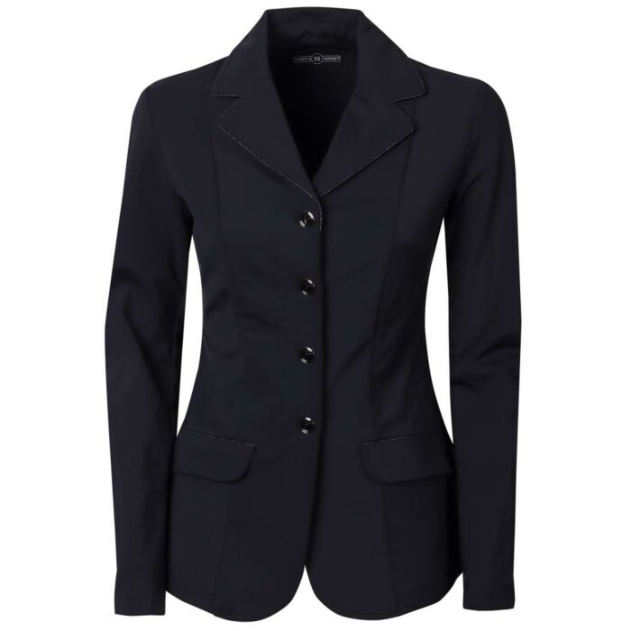 Wedstrijdjas Sparkle van Harry's Horse is gemaakt stretch materiaal en heeft een een leuke glitter piping langs de voorsluiting, zakken en paneel op de rug, uitgevoerd met twee steekzakken en een knoopsluiting met daarachter een ritssluiting.