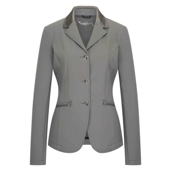 Mooie wedstrijdjas in de kleur grijs met afgedekte CF ritsen en 3 zichtbare knopen. Het jasje heeft 2 enkele paspelzakken met glittertap en strasssteentjes gesloten met blinde rits.