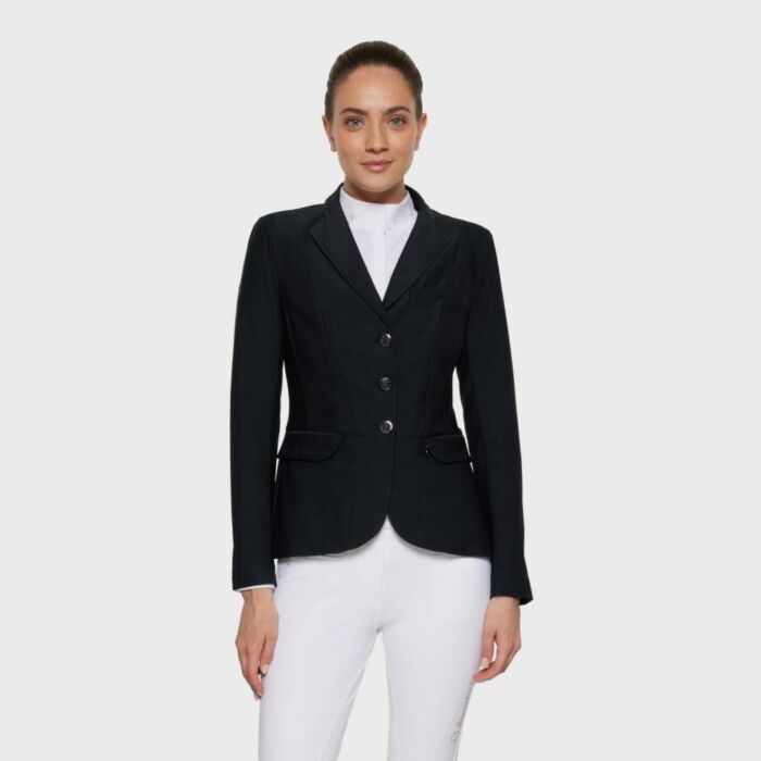 Het Samshield Victory Sculpt wedstrijdjasje in Black combineert innovatie met elegantie en is ontworpen voor ruiters die zowel stijl als functionaliteit eisen. De unieke snit, waarbij de voorkant iets korter is dan de achterkant, zorgt voor een flatterende pasvorm en extra comfort in het zadel. Subtiele details zoals het Swarovski® blazon-inzetstuk en de verborgen rits onder de knopen geven dit jasje een luxe uitstraling.