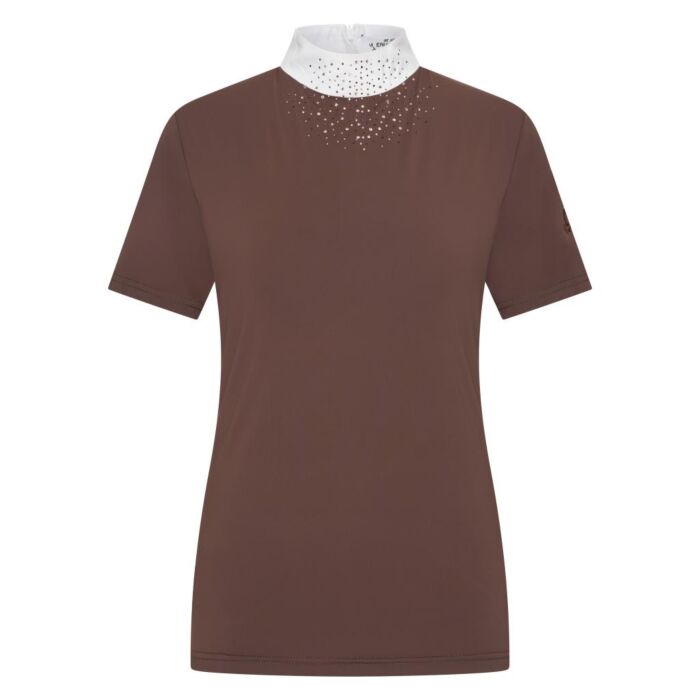 Elegant wedstrijdshirt in maat XS in de kleur Chocolate met verfijnde strassdetails bij de kraag en een aansluitende comfortabele pasvorm, verkrijgbaar bij Equidrôme in Venlo.