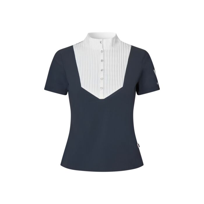 Het Kingsland Nala wedstrijdshirt in de kleur Navy is de perfecte combinatie van stijl, comfort en prestatie. Dit elegante wedstrijdshirt is speciaal ontworpen voor ruiters die op zoek zijn naar een klassieke uitstraling met een moderne touch. De witte plastron met verfijnde plissé details en subtiele kristalknopen geeft een luxueuze uitstraling, terwijl de zachte, ademende stof zorgt voor optimaal draagcomfort.